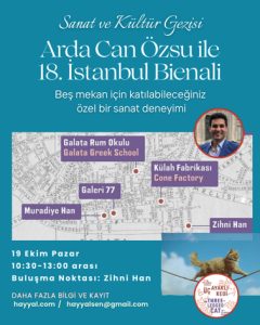 Zihni Han, Külah Fabrikası, Galeri 77, Muradiye Han ve Galata Rum Okulu gibi 5 farklı mekandaki tüm sanat eserlerinin yorumlanması ve arka planlarındaki kavramsal yönlerinin anlatılmasıyla gelişecek gezimizde ilgili tarihi mekanlar hakkında da genel bir fikir sahibi olacağız.
